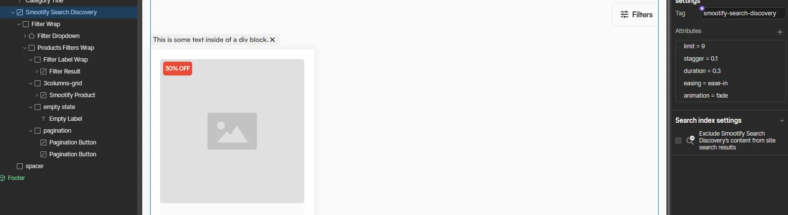 By default the search results are animated with a fade animation (animations are realized with motion.dev), you can change up the value by modifying the custom attribute that you find on the Smootify Search & Discovery element