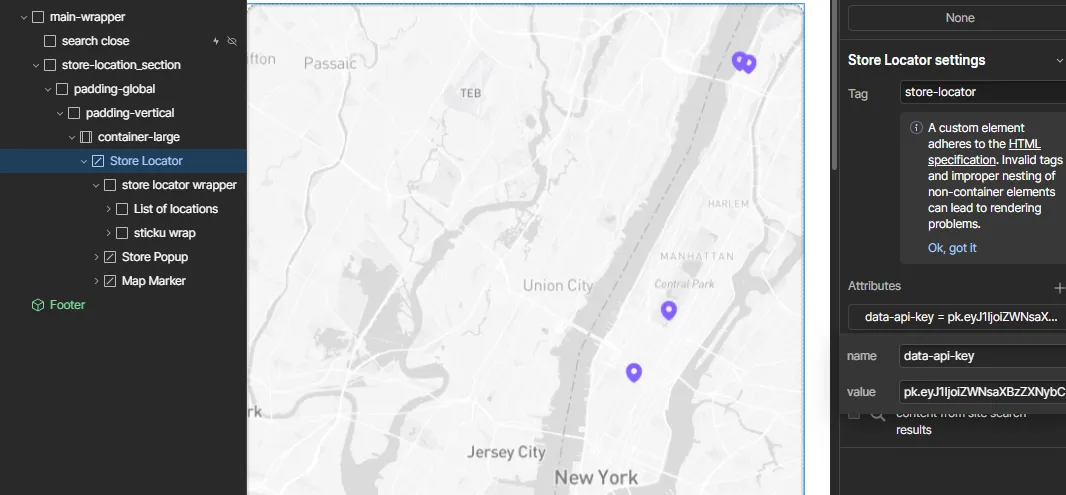 Select the Store Locator custom element (from the component used in the first step) into the Webflow navigator and paste the token into the data-api-key value.