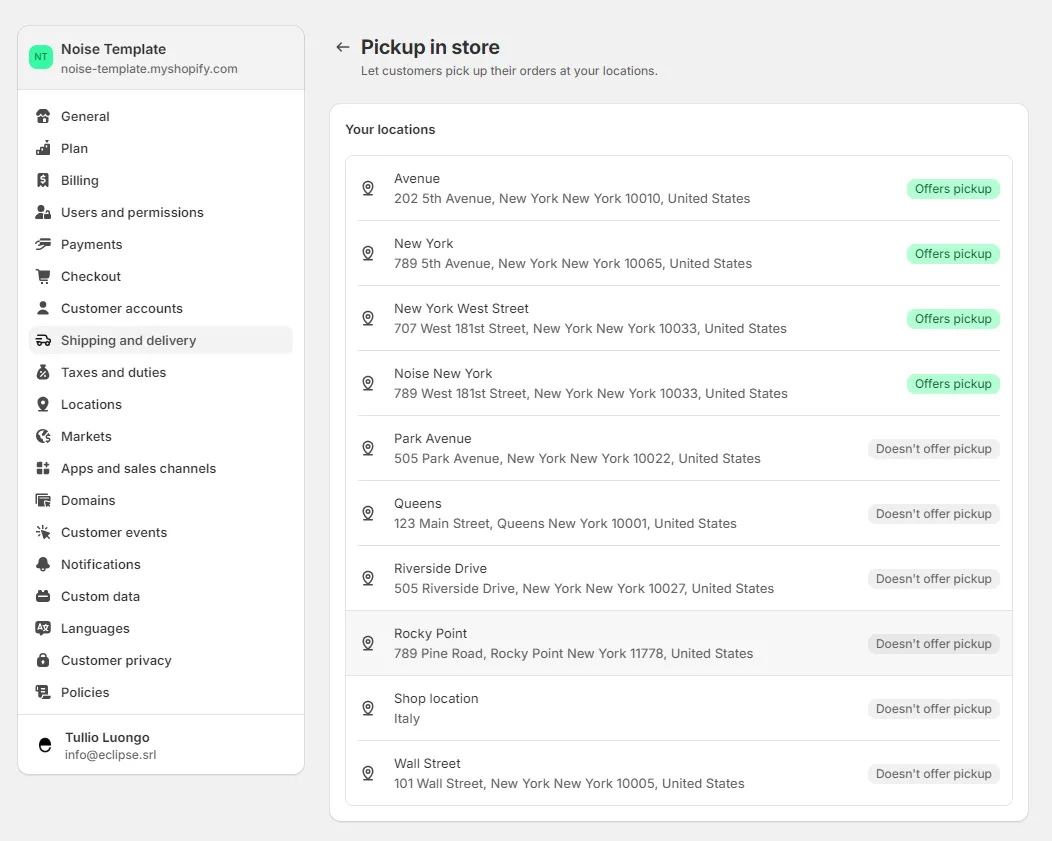 To add your stores locations, go to Shopify Settings and click on Locations. Then you need to add your locations clicking on the Add location button.