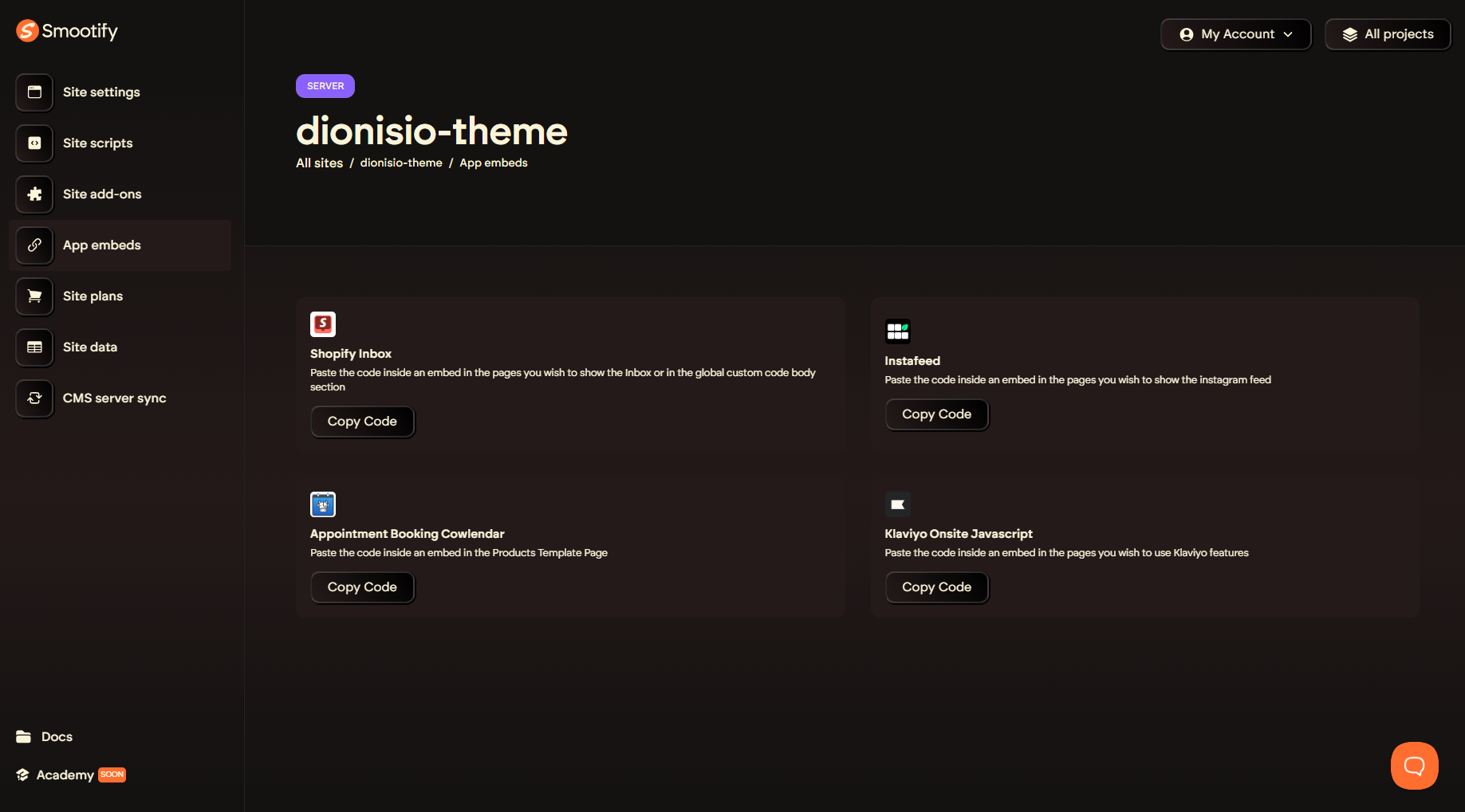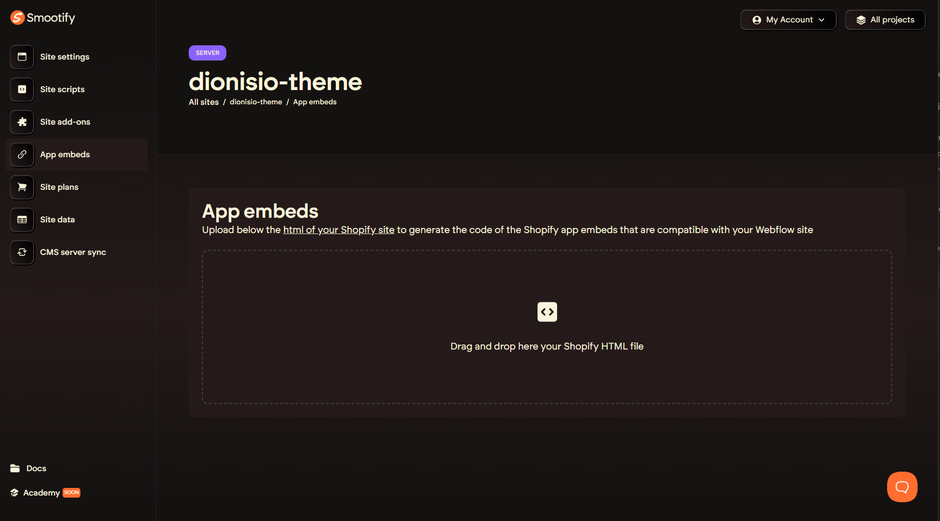 Some Shopify Apps do work by enabling App Embeds from the Shopify Customizer and are compatible with Webflow as well! We have created a tool inside the dashboard that automatically will help you using app embeds. This feature automatically parses the code of some apps and modifies it in order to make it compatible with Webflow & Smootify!